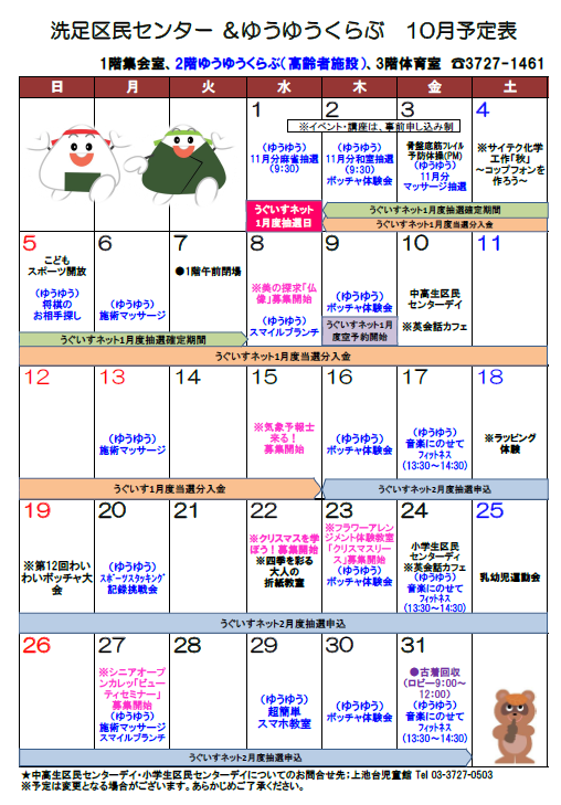 【洗足区民センター10月カレンダー】(こちらからダウンロードできます。)