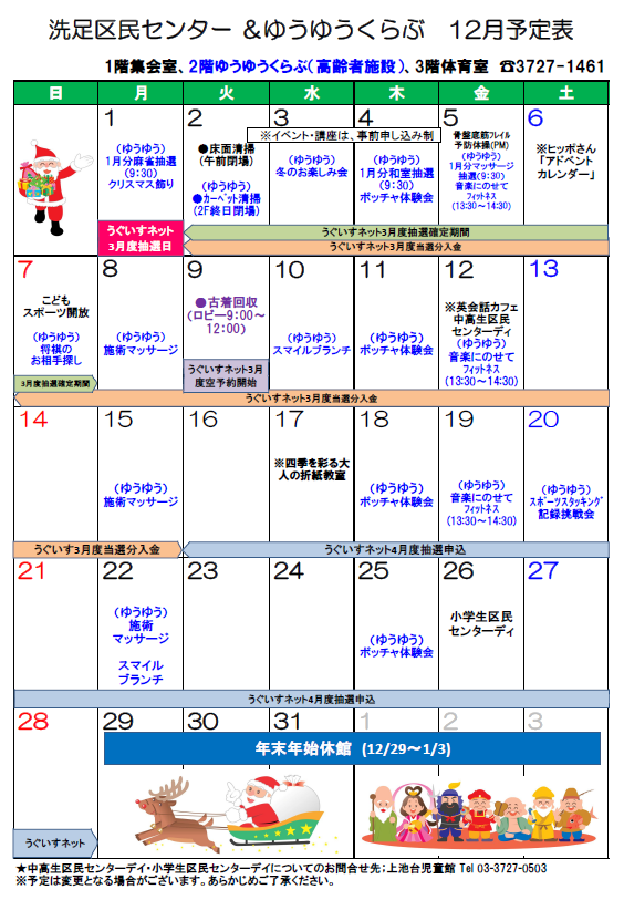 【洗足区民センター12月カレンダー】(こちらからダウンロードできます。)