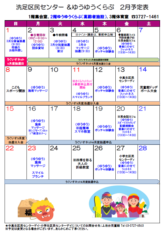 【洗足区民センター2月カレンダー】(こちらからダウンロードできます。)