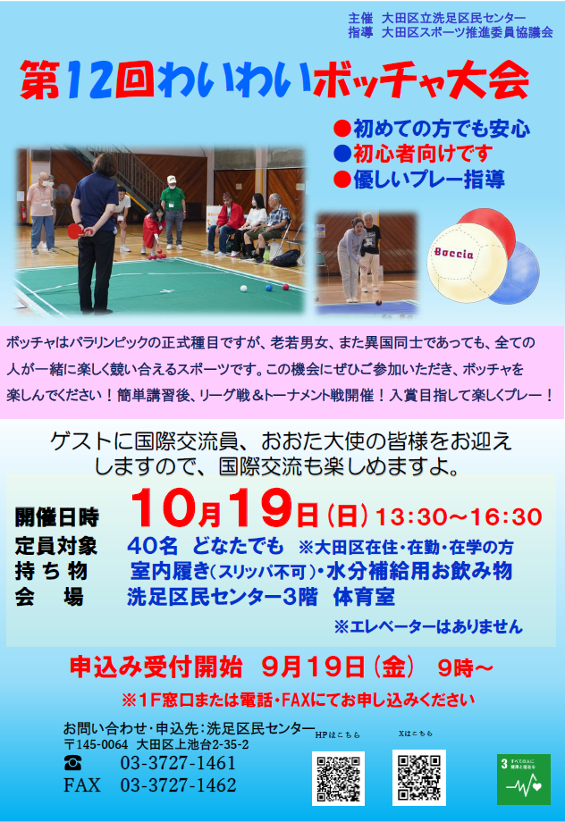 洗足区民センターでは、ボッチャ競技を推進しており、毎年2回ボッチャ大会を開催しています。 親子でも、お友達同士でも、日本語がわからない外国の方もお誘いあわせの上、お申し込みください。 |